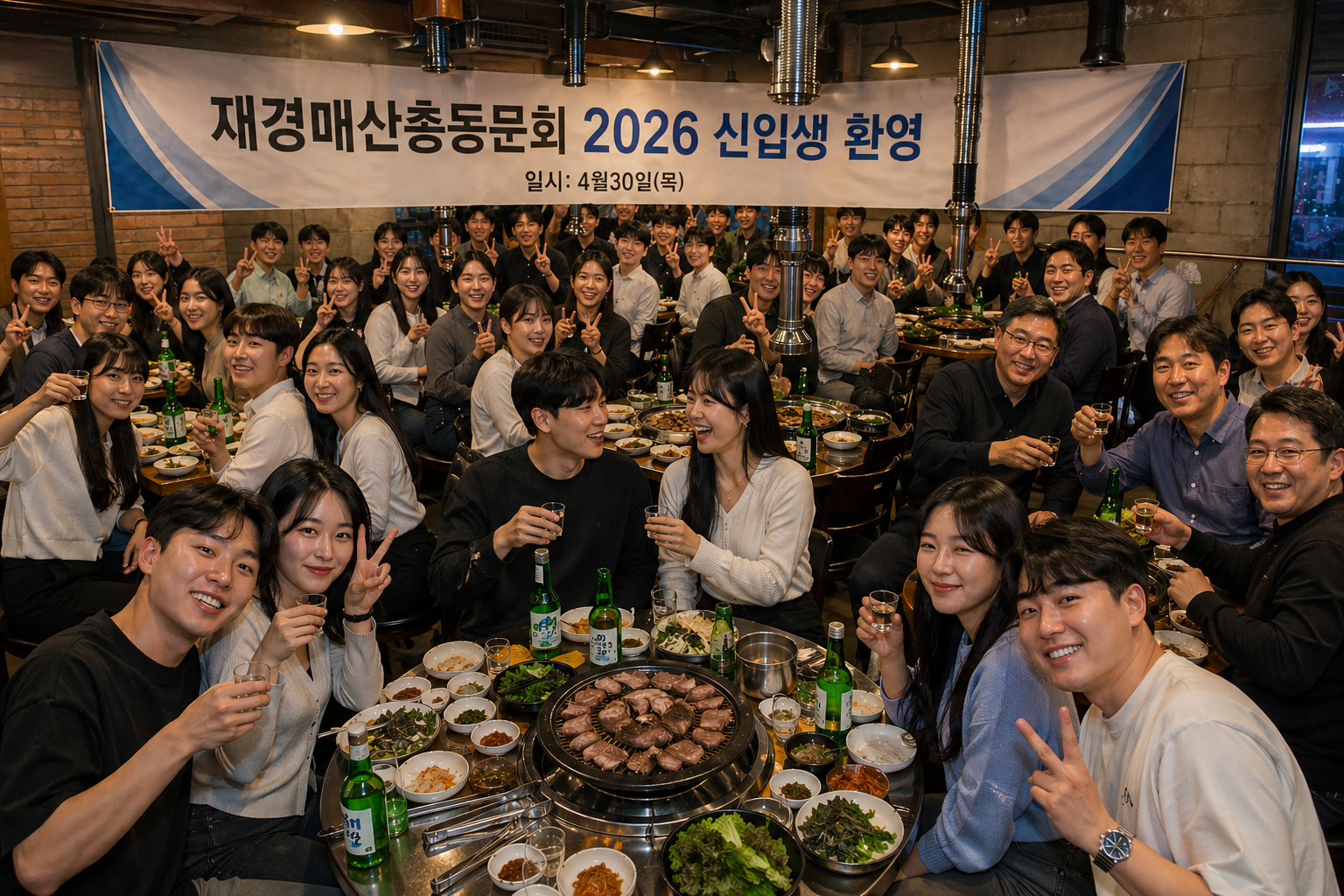 일시 : 4월 30일(목) 6시 30분 장소 : 이곱 착한고기 사당본점(사당역 10번출구 20M) 참석인원 : 서울, 경기, 인천 재학 대학생 1) 2026년(75회) 신입생 24명 2) 2018년(67회) ~ 2025년(74회) 재학생 20명 3) 전,현 집행부와 후배사랑 각별한 선배들 10명 ** 이미지는 AI 생성입니다 **